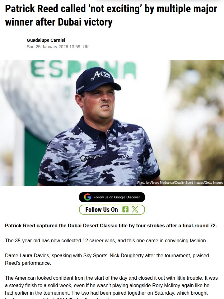 Karen Pierce+FollowCaptain America Silences Critics in DubaiPatrick Reed, aka 'Captain America,' just bagged his 12th career win at the Dubai Desert Classic, but the rivalry with Rory McIlroy still lingers in fans’ minds. While Dame Laura Davies praised Reed’s ice-cold composure, she also called him 'not exciting.' Reed himself admits he’s not here to please everyone—he lets his clubs do the talking. Love him or hate him, Reed’s steady hand keeps him in the spotlight, even if he’s not the crowd favorite. #Sports #Golf #PatrickReed00Share