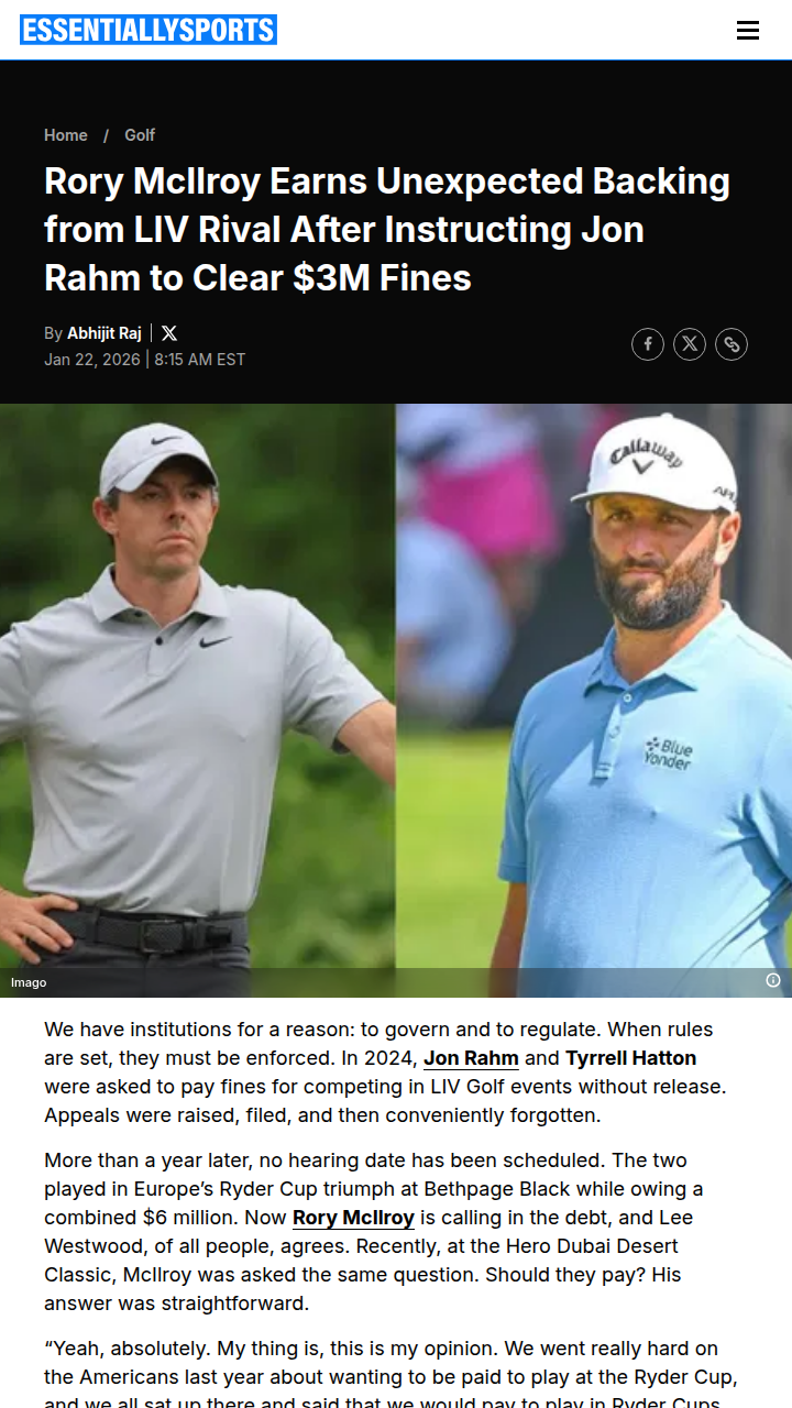 Ryan Wilkinson+FollowRory & LIV: Ryder Cup Fines ShowdownDrama heating up in Euro golf! Rory’s calling out Rahmbo and Hatton to pay up their $3M LIV fines before the next Ryder Cup. Shock twist: even Westy from LIV backs Rory, saying the DP World Tour needs to set a real appeal date—no more delays. With Rahm refusing to pay and the Tour staying silent, will they enforce the rules or keep kicking the can? This could shake up the 2027 Ryder Cup roster big time! #Sports #Golf #RyderCup00Share
