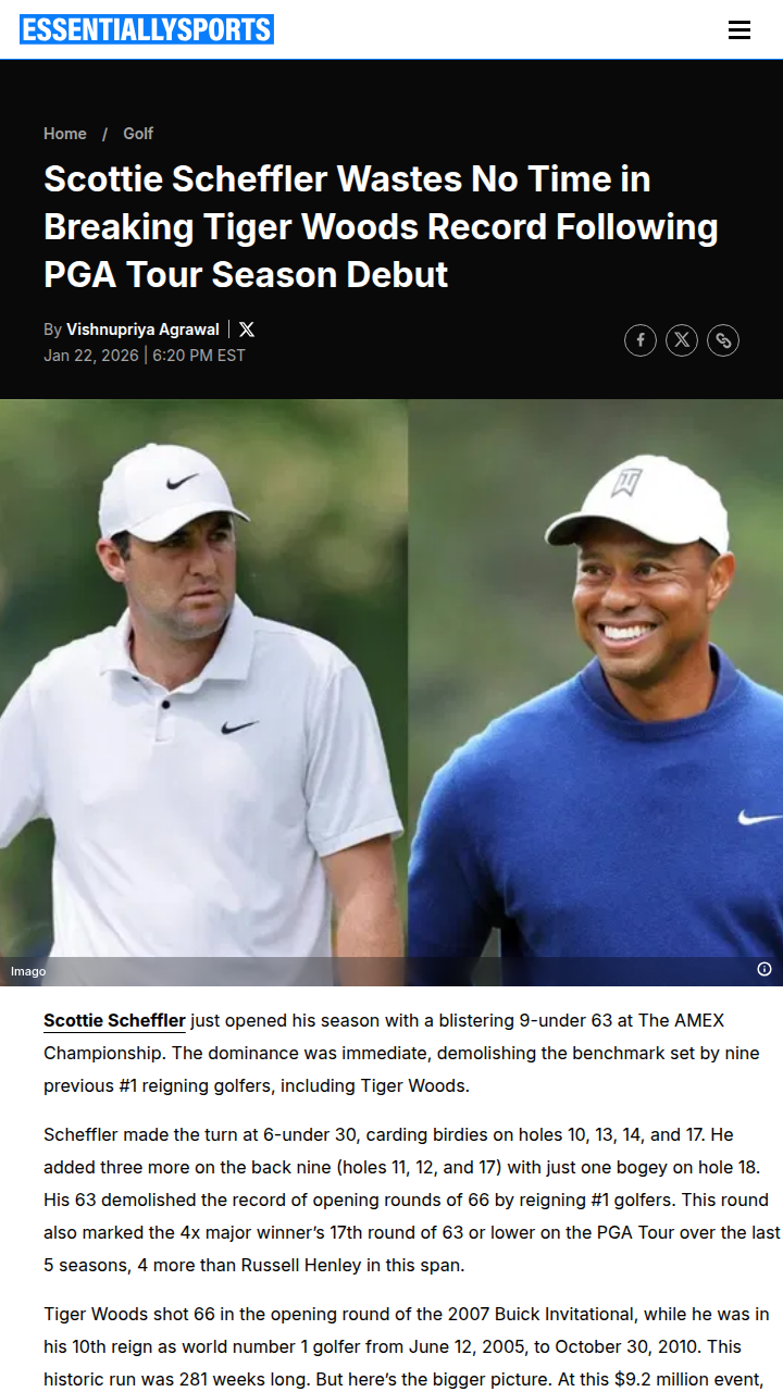Heather Garcia+FollowScheffler Shatters Tiger’s Record at AMEXScottie Scheffler just made history at The American Express, torching the course with a 9-under 63—smashing Tiger’s old mark for lowest season-opening round by a reigning world No. 1. That’s not just a hot start; it’s a statement. With his 141-week streak at No. 1, Scheffler’s halfway to Tiger’s legendary 281-week run. Can the Iceman keep this up and chase down the Big Cat’s record? Let’s hear your takes! #Sports #Golf #Scheffler10Share