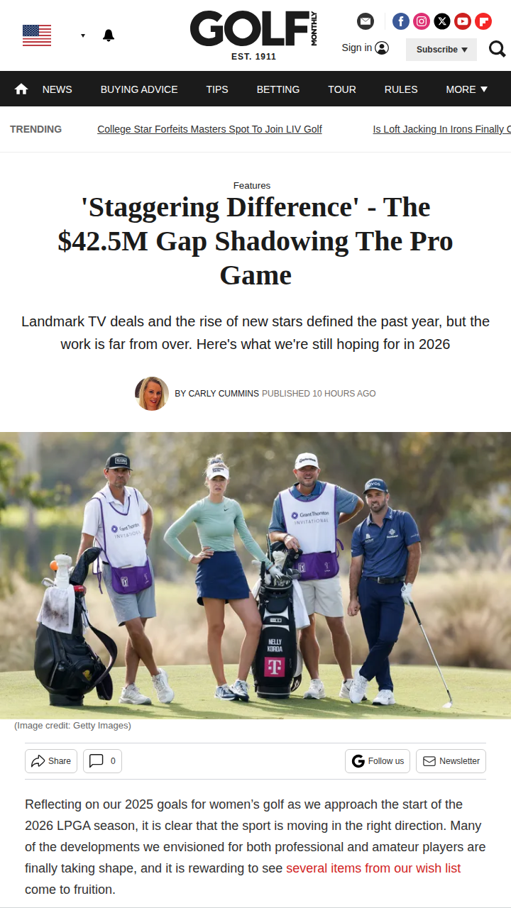 Karen Pierce+FollowLPGA’s $42.5M Pay Gap: Still Too Wide?Golf fans, what do you make of the jaw-dropping $42.5 million earnings gap between Scottie Scheffler and Jeeno Thitikul last season? The LPGA’s 75th anniversary brought record prize money and some huge wins for rising stars like Lottie Woad and Miyu Yamashita, but the pay disparity with the PGA Tour remains massive. Is the new TV deal and WTGL league enough to close the gap, or does women’s golf need more bold moves? Let’s hear your takes! #Sports #Golf #LPGATour00Share