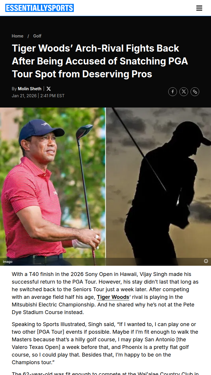 Heather Garcia+FollowVijay Singh Answers PGA Tour CriticsVijay 'The Big Fijian' Singh made headlines with his brief return to the PGA Tour at the Sony Open, finishing T40 against much younger competition. Some fans accused him of taking a spot from up-and-coming pros, but Singh set the record straight: he played for the love of the game and cherished one last shot at a favorite course. At 62, Singh says he’s happy on the Champions Tour but isn’t ruling out more PGA events if his body allows—especially at Augusta. Thoughts on Singh’s legacy and his right to compete? #Sports #Golf #VijaySingh00Share
