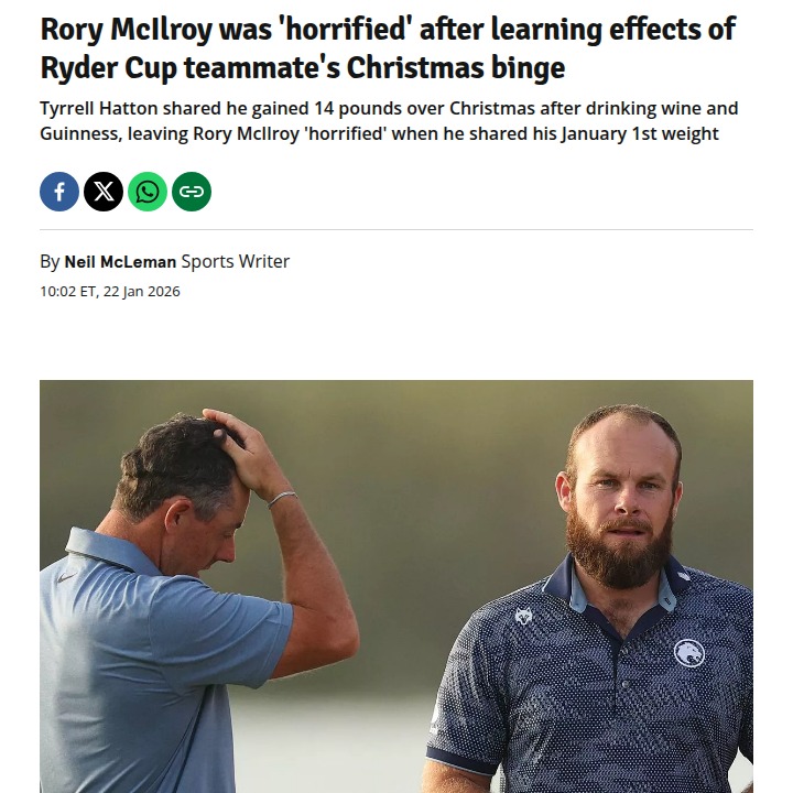 Tammy Davenport+FollowHatton Outduels Rory After Festive BingeAnyone else loving the banter between Tyrell Hatton and King Rory? Hatton admits he packed on 14 pounds over Christmas—thanks to plenty of Guinness and wine—yet still managed to outplay McIlroy at the Dubai Desert Classic. Rory was reportedly 'horrified' at Hatton's holiday weight gain, but the real story is Hatton's resilience. Despite a rusty swing and 'turning like the Titanic,' he carded a solid 70, outshining both Rory and Tommy Fleetwood. Classic Hatton! #Sports #Golf #RyderCup00Share