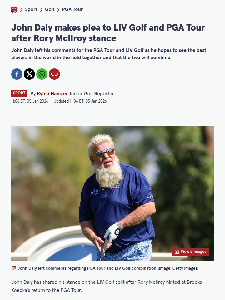 Krystal Lopez+FollowDaly Wants LIV & PGA Stars Back TogetherWild Thing John Daly just dropped some truth on the LIV Golf vs. PGA Tour split. After King Rory welcomed Brooks Koepka’s possible return, Daly said he’s tired of seeing the best golfers separated. He’s calling for both sides to bury the hatchet and get the top dogs back on the same stage every week—not just at the majors. Golf fans, do you miss those epic showdowns too? #Sports #Golf #GolfDebate02Share
