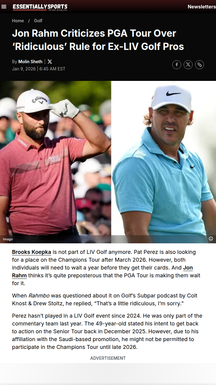 Tammy Davenport+FollowRahmbo Calls Out PGA Tour’s 'Ridiculous' RuleDid anyone catch Jon Rahm’s recent comments on the PGA Tour’s stance toward ex-LIV pros like Brooks Koepka and Pat Perez? Rahmbo didn’t hold back, calling the one-year wait for their cards 'a little ridiculous.' With Koepka and Perez stuck on the sidelines until late 2026, you have to wonder if leaving LIV was worth it. Meanwhile, DeChambeau’s Crushers GC and Rahm’s Legion XIII are keeping their squads intact for another epic rivalry next season. Thoughts on the Tour’s tough love? #Sports #Golf #GolfDebate00Share