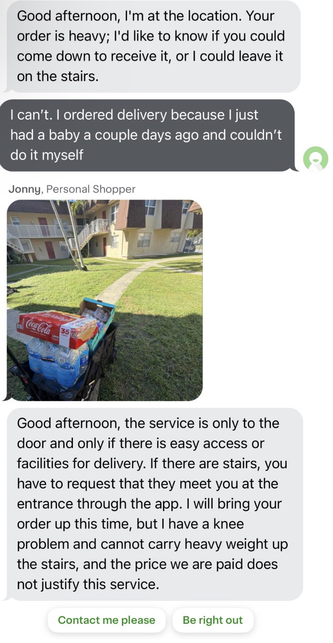 Justin Guerra+FollowDoes "delivery to the door" just not apply if there are stairs involved now?I usually order about four cases of water at a time since it lasts me a few weeks and I have never really had an issue until recently. I just had a baby a couple of days ago so I am stuck at home, and literally cannot carry heavy things right now. My shopper Jonny messaged me saying the order was too heavy and he wanted me to come down to get it or he was just going to leave it on the stairs.. I understand that multiple cases of water and soda are heavy but that is exactly why I paid for a delivery service in the first place! I always tip well after the job is actually done. But now it feels like some drivers expect a huge tip upfront before they even decide if they want to do their job properly. It is so frustrating because if you are physically unable to complete a delivery you should probably just pass the order to someone else instead of lecturing the customer. #DeliveryFails #Instacart #NewMomLife #GroceryDelivery #BadServiceStories 00Share