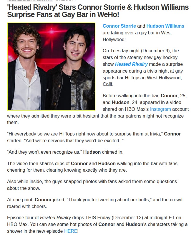Eddie Deleon+FollowConnor & Hudson light up WeHo’s Hi TopsWest Hollywood’s Hi Tops bar was buzzing when Connor Storrie and Hudson Williams from Heated Rivalry made a surprise visit during trivia night. Fans instantly recognized the stars, proving just how much the new show has caught on locally. The duo mingled, snapped selfies, and even joked about their on-screen chemistry—Connor thanked fans for tweeting about their butts, sparking laughter all around. With episode four dropping this Friday on HBO Max, it’s clear Heated Rivalry is becoming a must-watch in the community. Who else is loving the show’s bold energy and local pride? #Sports #HeatedRivalry #WeHo00Share