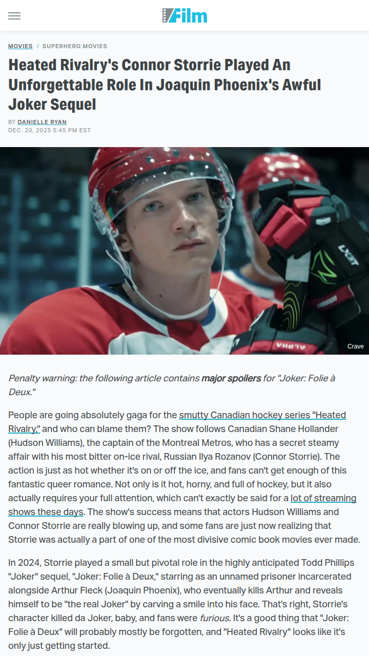 Eddie Deleon+FollowConnor Storrie Steals the Show in Joker 2Connor Storrie, known to "Heated Rivalry" fans as Rozanov, just shook up the comic book world with his wild cameo in "Joker: Folie à Deux." In a twist nobody saw coming, Storrie’s character offs Joaquin Phoenix’s Arthur Fleck and claims the Joker title for himself. Fans are split—some love the bold move, others say it ruins the original. Either way, Storrie’s star is rising fast, both on the ice and the big screen! #Sports #HeatedRivalry #ConnorStorrie10Share