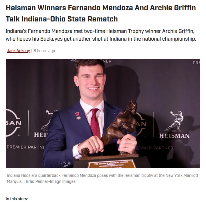 Jeffrey Armstrong+FollowHeisman Legends: Mendoza vs. Griffin Rematch?Hoosier Nation, how about Fernando Mendoza joining the Heisman club and chatting it up with Buckeye legend Archie Griffin? After Indiana's epic Big Ten title win over Ohio State, Archie was all class but playfully warned Mendoza that the Buckeyes want payback in the National Championship. With both teams boasting top defenses and QBs, are we headed for a Mendoza-Griffin rematch with even higher stakes? Can the Hoosiers keep the bragging rights, or will the Buckeyes bounce back? #Sports #Football #Heisman00Share