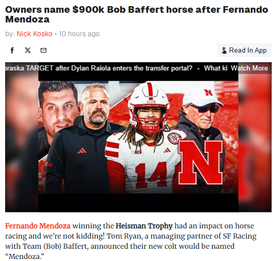 Daniel Barajas+FollowHeisman Winner Inspires $900k Racehorse NameFernando Mendoza just scored a wild honor—he’s got a $900k Bob Baffert-trained colt named after him! After winning the Heisman and leading Indiana to a Big Ten title, Mendoza’s name will now race for glory in the 2027 Triple Crown. The horse’s owner said Mendoza’s post-Heisman interview sealed the deal. Imagine seeing “Mendoza” at the Derby—talk about making your mark on AND off the field! #Pets #Heisman #FernandoMendoza10Share