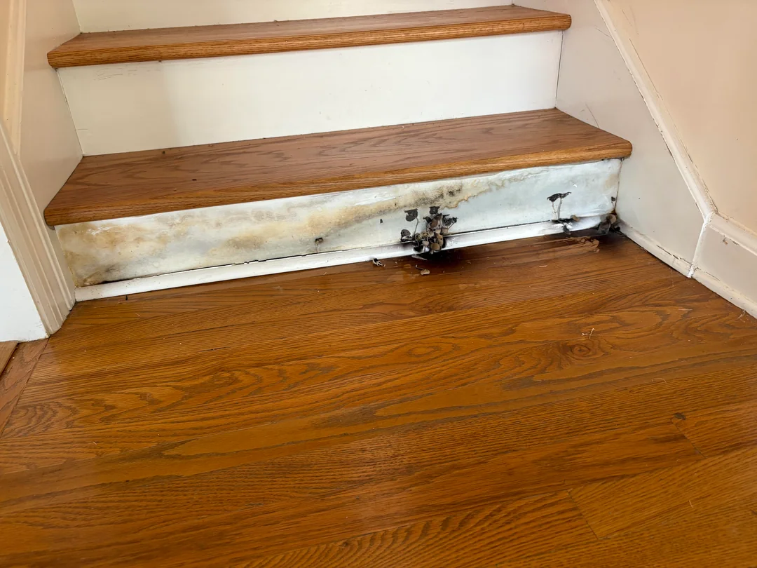I went to look at a super cheap house and saw this mess near the stairwell. There are literal mushrooms growing out of the wood near the bottom step, and it seems to be linked to a leaky toilet upstairs. People are telling me that actual mushrooms means the underlying water damage and mold is incredibly advanced. This leak has been going on for years, probably long enough for the sewage water to rot the wood, turning it into fertile ground for this fungal growth. The consensus is that the whole area needs to be torn out—drywall, flooring, maybe even structural wood—to fix the leak and deal with the rot that's definitely hiding beneath the surface. It looks like a simple repair that turned into a five thousand dollar project overnight. #HomeMaintenance #WaterDamage #Mold
