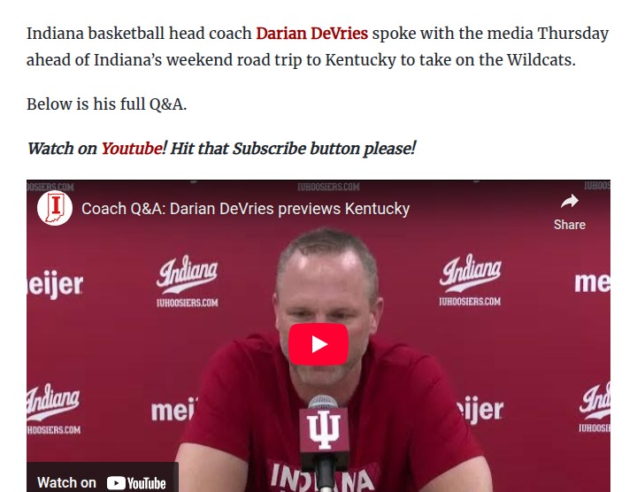 Amy Tanner+FollowIndiana heads to Kentucky for high-stakes showdownIndiana basketball fans, this weekend’s trip to Kentucky is shaping up to be a real test for Coach Darian DeVries and the Hoosiers. DeVries opened up about the team’s mindset and how they’re preparing to face the Wildcats on their home turf. With both teams hungry for a statement win, this matchup could have a big impact on the rest of the season. How do you think Indiana will handle the pressure in such a tough environment? Let’s hear your predictions and what you’re most excited to see! #Sports #Basketball #IUBasketball00Share