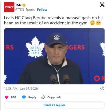 Martha Garza+FollowBerube’s Battle Scars: Leafs’ Bench Boss Shows GritChief Craig Berube is turning heads for more than his coaching lately—he showed up with a massive cut and black eye after a self-inflicted gym mishap. True to hockey culture, Berube shrugged it off, joking the 'other guy' looks worse. With the Leafs fighting for a playoff spot, fans are buzzing: will this tough-as-nails attitude spark a turnaround for Toronto? #Sports #IceHockey #LeafsNation00Share