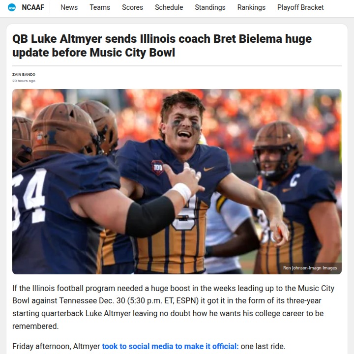 Jeffrey Armstrong+FollowAltmyer’s big decision: Illinois fans get one more gameLuke Altmyer is bucking the trend and suiting up for Illinois in the Music City Bowl against Tennessee, even as many top college QBs are skipping bowl games these days. Altmyer’s commitment means Illini fans get to see their record-setting quarterback in action one last time. With 56 career TDs and a 64.5% completion rate, he’s been a huge part of Illinois’ recent success. What do you think—should more players stick it out for their teams, or is it smarter to focus on the future? #Sports #Football #IllinoisFootball10Share