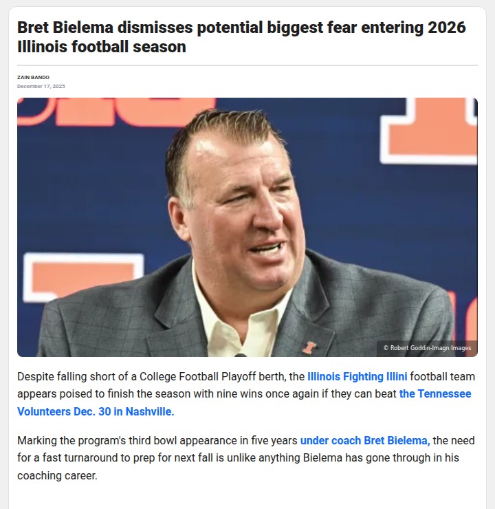 Aaron Taylor+FollowIllinois football faces major roster shakeupIllinois football is bracing for a whirlwind offseason, with Coach Bret Bielema meeting with nearly every player to talk about who’s staying, who’s leaving, and who might join the team next. Even as the Illini gear up for their bowl game against Tennessee, Bielema is already deep into conversations about the future, acknowledging that up to 10 players could hit the transfer portal after the season. With roster changes coming fast, fans are left wondering how the team will look next fall. How do you feel about this new era of constant roster turnover? #Sports #Football #IllinoisFootball00Share