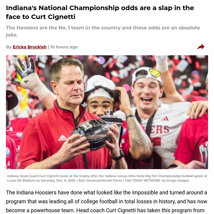 phughes+FollowIndiana Hoosiers snubbed in championship oddsIndiana just pulled off an undefeated season, clinched their first Big Ten title since 1967, and earned the No. 1 seed in the College Football Playoff—yet Vegas still puts Ohio State ahead of them to win it all. Even after knocking off the Buckeyes and making history, the Hoosiers are underdogs in the eyes of oddsmakers. Is this just classic Ohio State bias, or are people still doubting Indiana’s Cinderella run? With a first-round bye, Indiana has another shot to prove everyone wrong. What do you think—are the Hoosiers being disrespected, or is Vegas onto something? #Sports #Football #IndianaHoosiers00Share