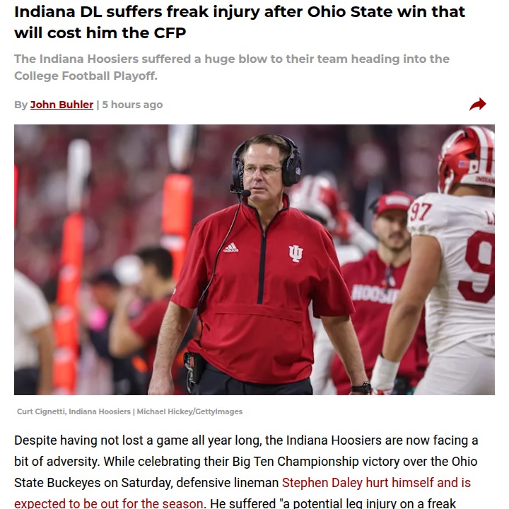 Michael Pitts+FollowDaley’s Injury Rocks Indiana vs. Ohio StateTough break for the Hoosiers—literally. Stephen Daley, the relentless edge rusher who helped Indiana stay undefeated, suffered a freak leg injury celebrating the Big Ten title win over the Buckeyes. With Daley out for the College Football Playoff, Coach Cignetti’s crew will need to dig deep and adjust, especially with the Rose Bowl looming. Can Indiana’s offense step up and keep the dream alive without their defensive anchor? #Sports #Football #IndianaHoosiers00Share