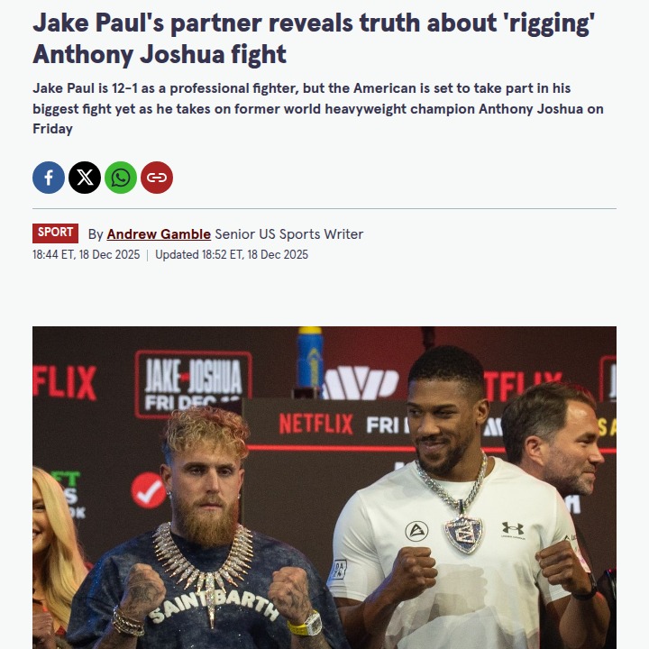 Cathy Sullivan+FollowJake Paul vs Anthony Joshua: Is It Rigged?The hype is real for Jake Paul’s showdown with AJ, but the talk of ‘rigging’ is heating up again. Paul’s business partner just set the record straight: the only time they bent the rules was for Iron Mike, not for Jake. With AJ’s power and pedigree, anything but a quick KO would raise eyebrows, but both camps insist this is a legit, sanctioned fight. Are you buying it, or is this just more boxing drama? #Sports #Wrestling #JakePaul00Share