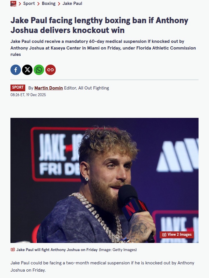 Kendra Ward+FollowJake Paul vs Joshua: KO Ban Looms?Fight fans, the hype is real! Problem Child Jake Paul is risking a two-month medical suspension if AJ—Anthony Joshua—delivers the knockout everyone’s predicting in Miami. With a 26lb weight gap and the boxing world already questioning Paul’s pro credentials, this David vs Goliath showdown is more than just a spectacle. If AJ lands that killer punch, Paul’s ring return could be on ice for a while. Who’s your money on? #Sports #Wrestling #JakePaul11Share