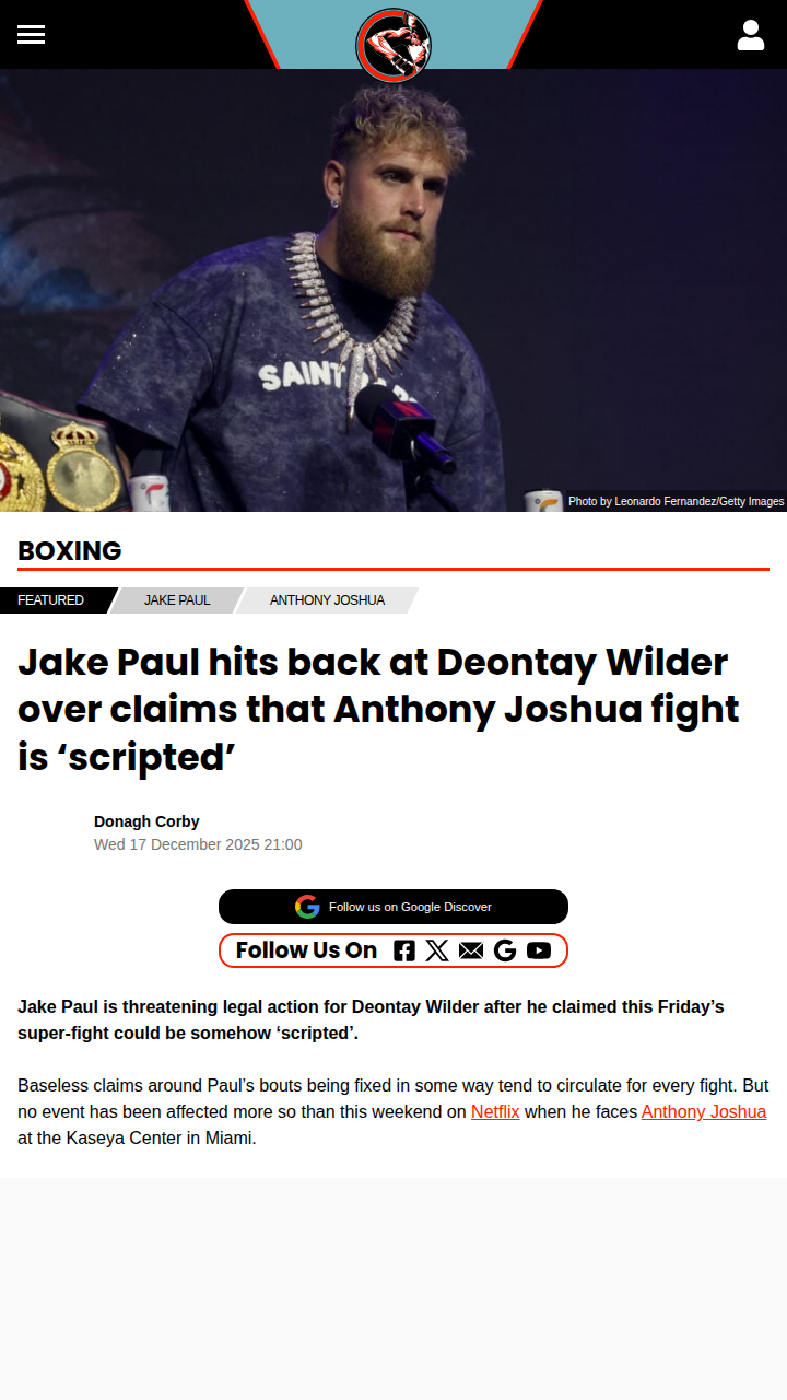 reneewang+FollowJake Paul vs Anthony Joshua: Rigged or Real?The Problem Child is firing back! Jake Paul is threatening legal action after Deontay “Bronze Bomber” Wilder called his upcoming fight with AJ ‘scripted.’ Wilder’s comments have only fueled the fire around this Netflix super-fight, with fans already doubting if Paul can hang with Joshua. Jake says there’s zero truth to the fix rumors and even AJ confirmed there’s nothing shady in the contract. Is this rivalry getting out of hand, or is it just classic fight week drama? Sound off below! #Sports #Wrestling #JakePaul02Share