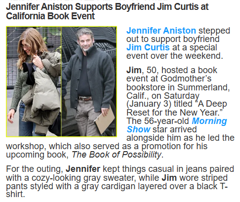 Shannon Estrada+FollowJennifer Aniston Spotted at Jim Curtis’ Book Event 📚Jennifer Aniston just made things official-official with Jim Curtis by showing up at his sold-out book event in Summerland! She rocked her natural grey roots and looked super chill in a green sweater and jeans. Fans are buzzing about how she’s not hiding their romance anymore, especially after going IG official last month. Plus, Jerry Seinfeld and Portia De Rossi were there too! Are we about to see Jenn in full supportive girlfriend mode? #Entertainment #Books #JenniferAniston00Share