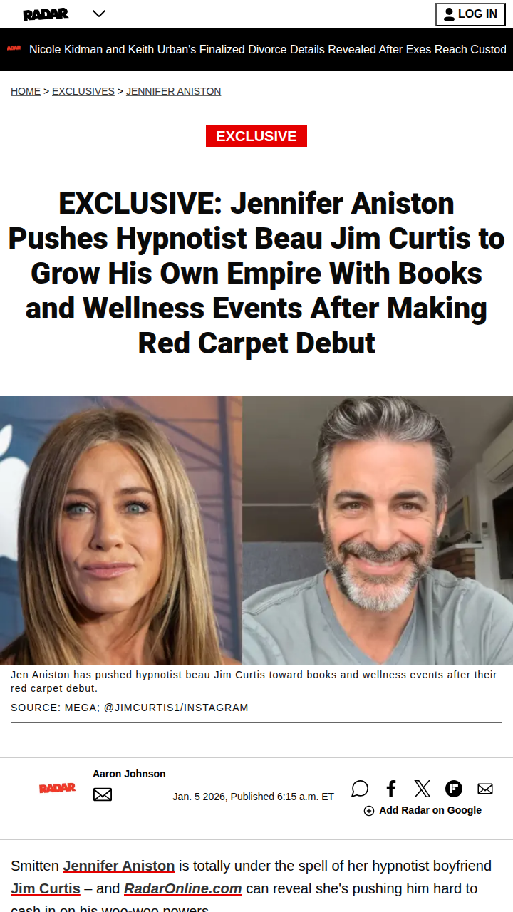 Tracy Johnson+FollowJen Aniston’s Power Move for Hypnotist BF 😲Jennifer Aniston is reportedly pushing her hypnotist boyfriend, Jim Curtis, to level up his career—think bestselling books and wellness events! Some fans are loving her go-getter attitude, but others wonder if Jen’s high-powered style might clash with Jim’s laid-back vibe. Is she helping him shine, or is this too much pressure? The fandom is split! #Entertainment #Celebrity #JenniferAniston12Share