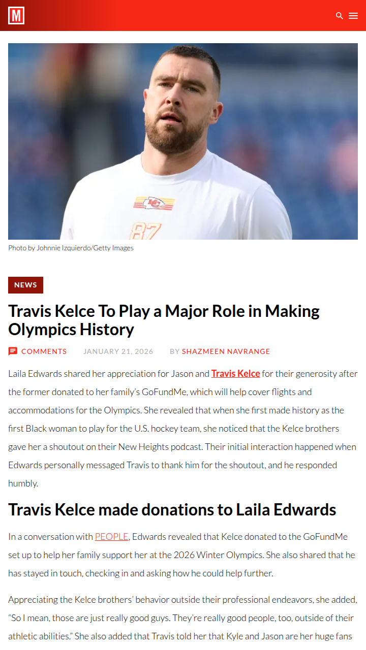 Molly Tucker+FollowKelce Bros Lift Laila Edwards to Olympic GloryHow about this for a power assist? The Kelce brothers—Jason and King Kelce—just scored big off the field by helping Laila Edwards’ family get to Milan for the Winter Olympics. Laila’s already making history as the first black woman on Team USA’s hockey squad, and now her parents can watch her live thanks to the Kelces’ generous GoFundMe donation. Talk about hometown heroes supporting a trailblazer! #Sports #IceHockey #KelceBrothers00Share