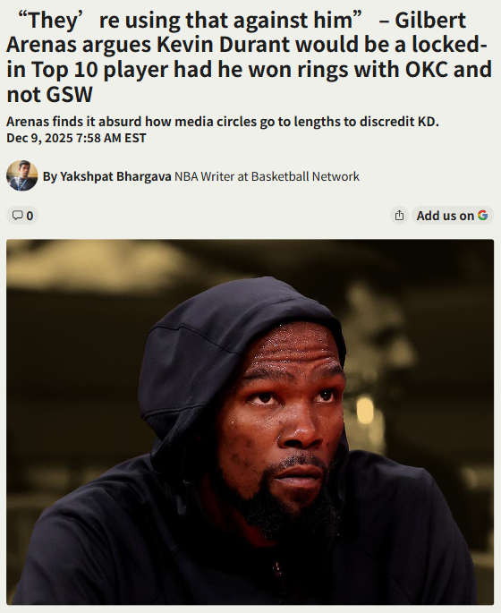 guerrajohn+FollowIs KD’s Legacy Unfairly Judged?Agent Zero (Gilbert Arenas) just dropped a hot take on the Slim Reaper’s legacy. He says if KD had won his rings with OKC instead of the Warriors, he’d be a lock for the all-time Top 10. But because he joined a superteam, the media keeps using that against him—while Steph gets full credit for all four of his titles. Do you think KD gets a raw deal in these GOAT debates? #Sports #Basketball #KevinDurant00Share