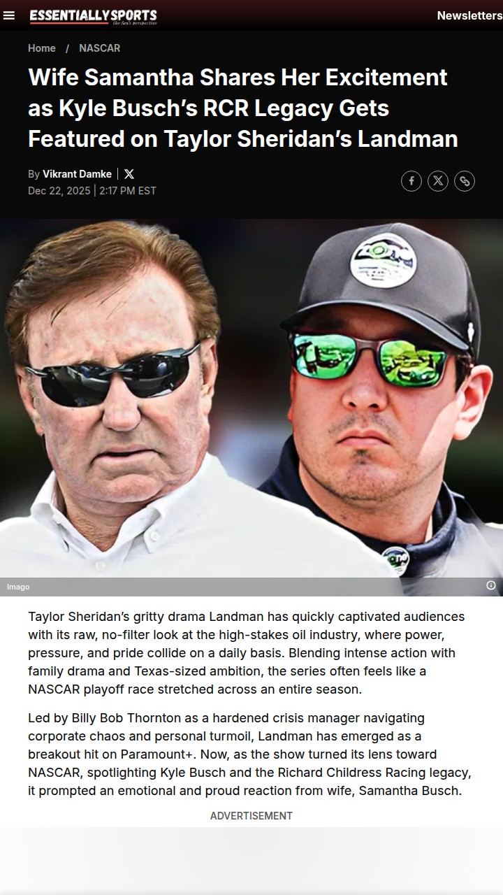 andersonkaren+FollowKyle Busch’s RCR Era Hits the Big ScreenDid anyone else catch Rowdy’s No. 8 ride popping up on Landman? Talk about a crossover! Samantha Busch was all over Instagram, beaming with pride as King Kyle’s RCR legacy—and that Lucas Oil partnership—got a prime-time nod. For longtime fans, this wasn’t just product placement; it was a nod to how deep the Busch family roots run in racing. Love seeing NASCAR and Hollywood collide like this! #Sports #KyleBusch #RCR90Share