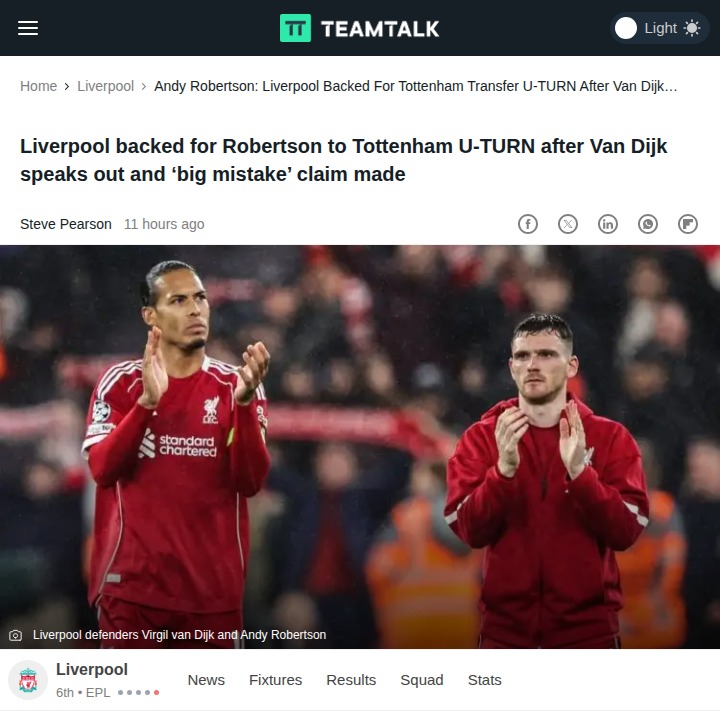 kochcandice+FollowRobbo to Spurs? Van Dijk Calls Out Big MistakeHuge transfer drama brewing as Liverpool’s own vice-captain Robbo could be on his way to Spurs for just £5m! King Virgil isn’t having it, calling Robertson “very important” and urging the Reds to rethink. With Liverpool’s backline already stretched, letting the Scottish legend go now feels risky. Is this a rivalry twist or a massive misstep? Let’s hear your takes! #Sports #Soccer #LFC00Share