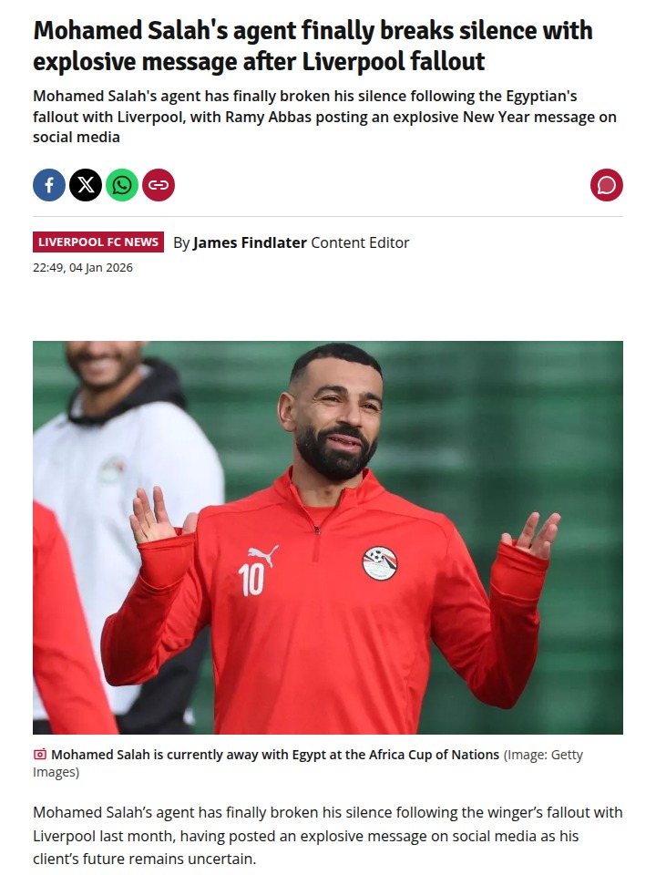 Jamie Mack+FollowSalah Fallout: Agent’s Cryptic New Year PostThe Egyptian King’s future at Anfield is back in the spotlight after his agent, Ramy Abbas, dropped a mysterious New Year’s message on social media. With Mo benched and rumors swirling about a rift with Arne Slot, fans are buzzing about whether Salah’s days in red are numbered. Is this just mind games, or is a transfer looming? Let’s hear your take, Reds! #Sports #Soccer #LFC00Share