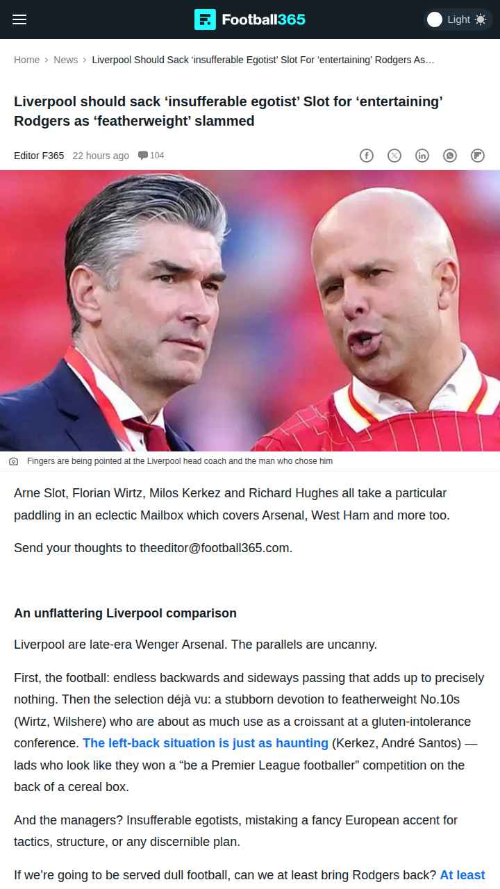 Malik Williams+FollowSlot or Rodgers: Who Should Lead the Reds?Fellow Reds, are we really seeing late-era Wenger Arsenal vibes at Anfield? The Slot experiment is looking more like a tactical dead end, with sideways passing and a midfield that offers neither creativity nor protection. Gakpo’s predictability up front is frustrating, and the defense feels like a lottery every week. Some fans are calling for a return to the entertainment of the Rodgers era—at least he gave us some drama! Is it time for a change, or do we stick with Slot and hope for a turnaround? #Sports #Soccer #LFC00Share