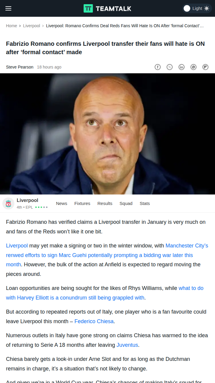 Timothy Thompson+FollowChiesa’s Anfield Exit: Heartbreak Incoming?Looks like the transfer guru himself, Fabrizio Romano, has all but confirmed what many Reds fans feared—Federico Chiesa could be heading back to Juventus this January. With Juve making formal contact and Chiesa struggling for minutes under Slot, it’s hard to see how Liverpool keeps hold of one of their most dynamic wingers. If this goes through, expect plenty of heartbreak in the Kop! #Sports #Soccer #LFC00Share