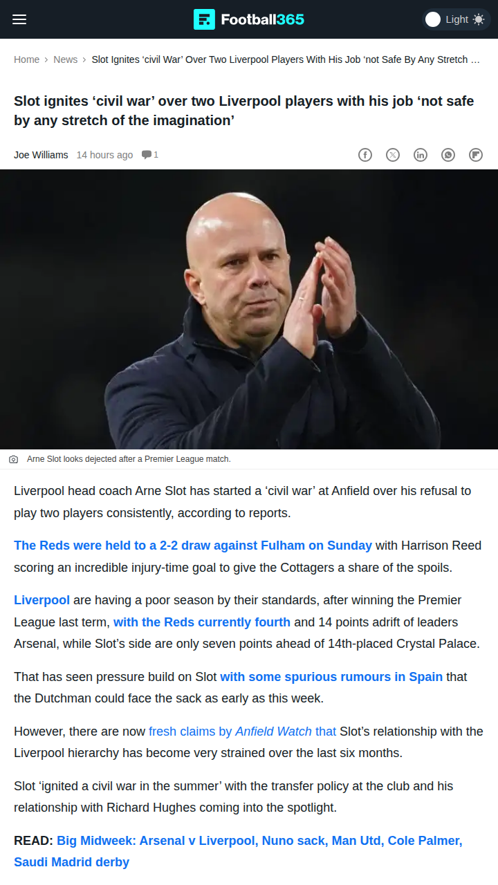 Maurice Miller+FollowSlot vs Hughes: Anfield Tensions Boil OverLooks like there’s real drama behind the scenes at Anfield! Reports say Arne Slot and Richard Hughes clashed big time over young Rio Ngumoha after the sale of Luis Diaz. Slot wanted a proven winger, but Hughes insisted on giving Ngumoha minutes. Now, with the Reds slipping to fourth and the pressure mounting, even legends like Aldo are worried Slot could be on the chopping block. Is this the start of a new civil war at Liverpool? #Sports #Soccer #LFC00Share