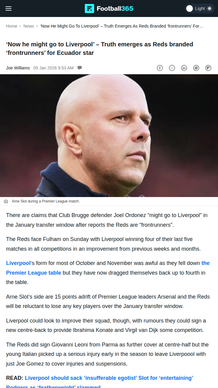 watkinsross+FollowReds Eye Ecuadorian Star Amid Transfer BuzzBig talk in the Kop this week: Liverpool are being called frontrunners for Club Brugge’s Joel Ordonez, with some insiders saying the Ecuadorian defender could land at Anfield this January. With King Virgil and Ibou needing backup, Ordonez could be a smart move—though Brugge insists he’s not leaving soon. Is this just classic transfer window smoke, or will the Reds pull off a late coup? Let’s hear your takes! #Sports #Soccer #LFC00Share