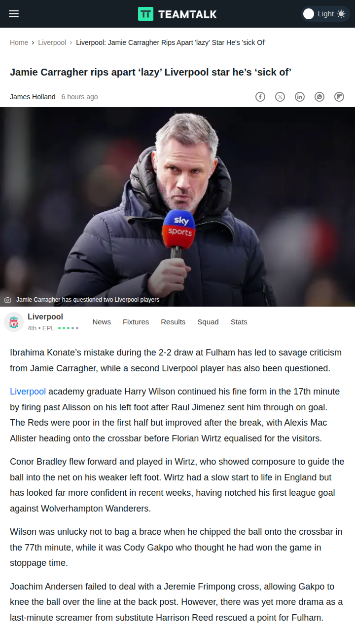Allison Travis+FollowCarragher Slams Konate After Fulham DrawJamie Carragher didn’t hold back on Sky Sports, calling out Ibou Konate for his “lazy defending” that let Harry Wilson open the scoring for Fulham. The ex-Red legend said he’s “sick of seeing it” and questioned whether it’s a tactical issue or just a lack of effort. The drama didn’t stop there—Wirtz’s equalizer looked offside to many, but VAR let it stand. Liverpool’s defense is under the microscope again after dropping more points in the race for top four. #Sports #Soccer #LFC00Share