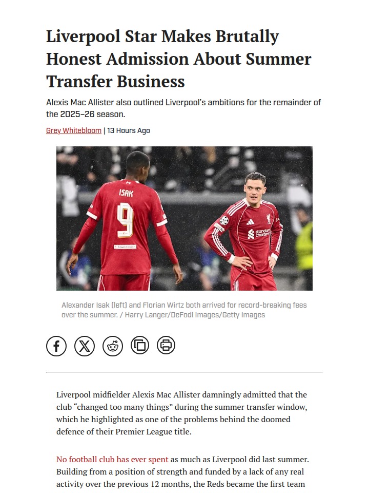 Allison Travis+FollowReds’ Costly Summer Gamble BackfiresWow, tough words from Mac Allister after Liverpool’s wild £400m summer spree. The midfield maestro admits the Reds “changed too many things” trying to rebuild after losing stars like Trent and Núñez. Despite bringing in big names like Isak and Wirtz, the chemistry just isn’t there, and it’s showing in the results. Hard to hear, but do you agree with Macca that too much change too fast is to blame for our title defense collapse? #Sports #Soccer #LFC00Share