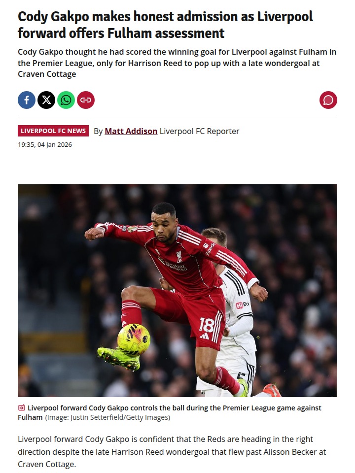 Timothy Thompson+FollowFulham vs Liverpool: Gakpo’s Heartbreak Late OnTalk about a rollercoaster at Craven Cottage! The Reds looked set for a dramatic win after Cody Gakpo’s late strike, but Fulham’s Harrison Reed had other ideas, smashing in a stunner in stoppage time. Gakpo was honest post-match—he thought he’d sealed it, but Liverpool’s defense just couldn’t hold on. King Klopp’s men showed flashes of brilliance, but consistency is still the missing piece. Thoughts on that last-minute equalizer? #Sports #Soccer #LFC00Share