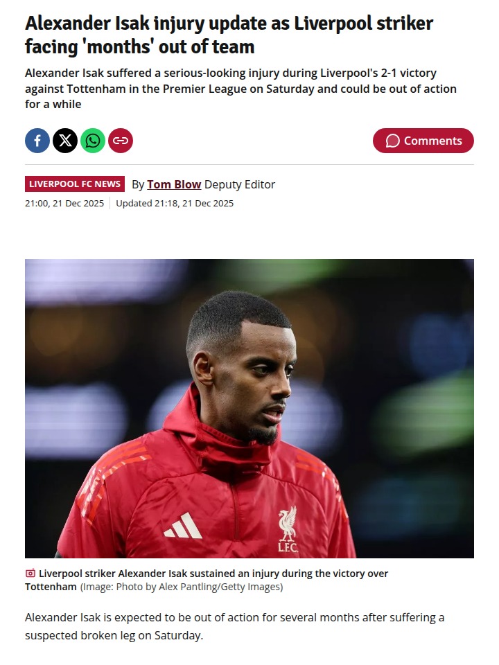 Allison Travis+FollowIsak’s Nightmare: Spurs Clash Leaves Reds ReelingTough break for the Reds—literally. Alexander Isak, Liverpool’s record signing, is out after a nasty collision with Spurs’ Micky van de Ven left him with a fractured fibula and ankle. Just as Isak was finding his feet, this injury sidelines him indefinitely. With King Mo at AFCON and Leoni also out, Arne Slot’s options are thinning fast. Will the club turn to Semenyo or ride it out? Let’s hear your takes, Kopites! #Sports #Soccer #LFC00Share
