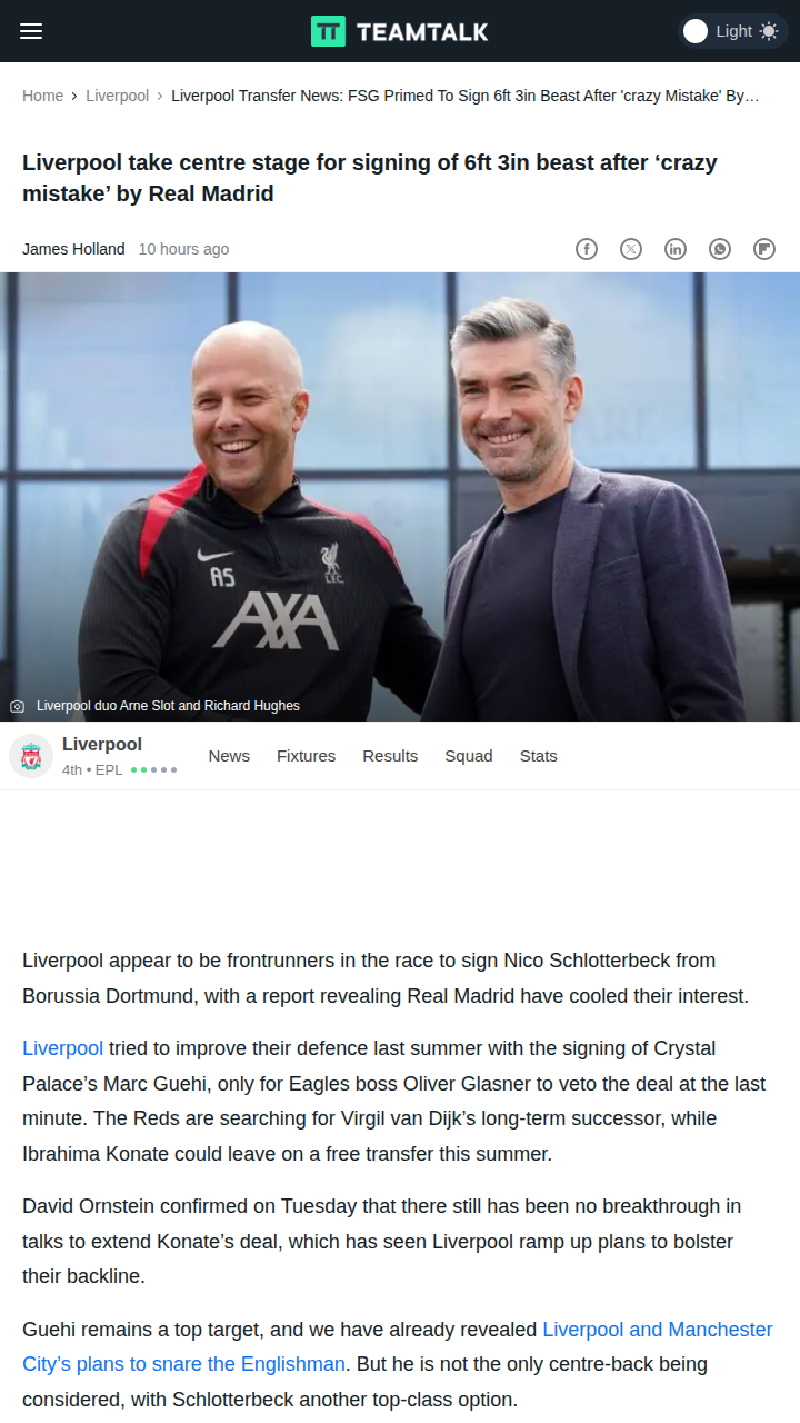 Tara Moran+FollowReds Eye Schlotterbeck After Madrid’s ‘Mistake’Looks like Liverpool are leading the charge for Nico Schlotterbeck after Los Blancos surprisingly backed off. With King Virgil not getting any younger and Ibou’s contract talks stalling, the Reds are searching for a new defensive anchor. Real Madrid’s decision to pass on the 6ft 3in German is being called a ‘crazy mistake’—could this open the door for Klopp’s crew to land a bargain? Let’s talk: is Schlotterbeck the next big thing at Anfield? #Sports #Soccer #LFC00Share