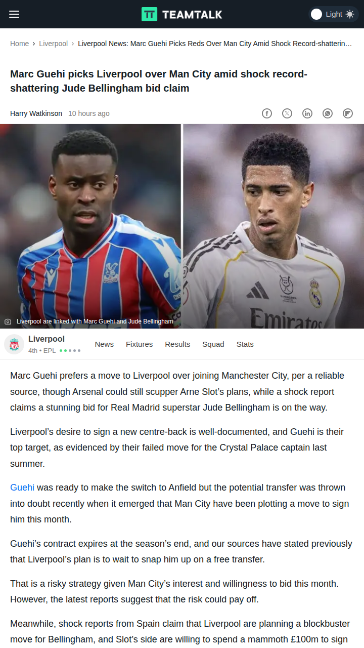 Jillian Morse+FollowGuehi Eyes Anfield Over Etihad in Transfer SagaBig news for Reds fans: Crystal Palace skipper Marc Guehi reportedly prefers a move to Anfield over joining Pep’s Cityzens, despite late interest from Arsenal and Bayern. With Guehi’s contract winding down, Liverpool’s gamble to wait for a free transfer could pay off—unless Arsenal swoops in. Meanwhile, wild rumors link the Reds to a record-smashing bid for Jude Bellingham, but take that with a grain of salt. Thoughts on how this shakes up the rivalry? #Sports #Soccer #LFC10Share