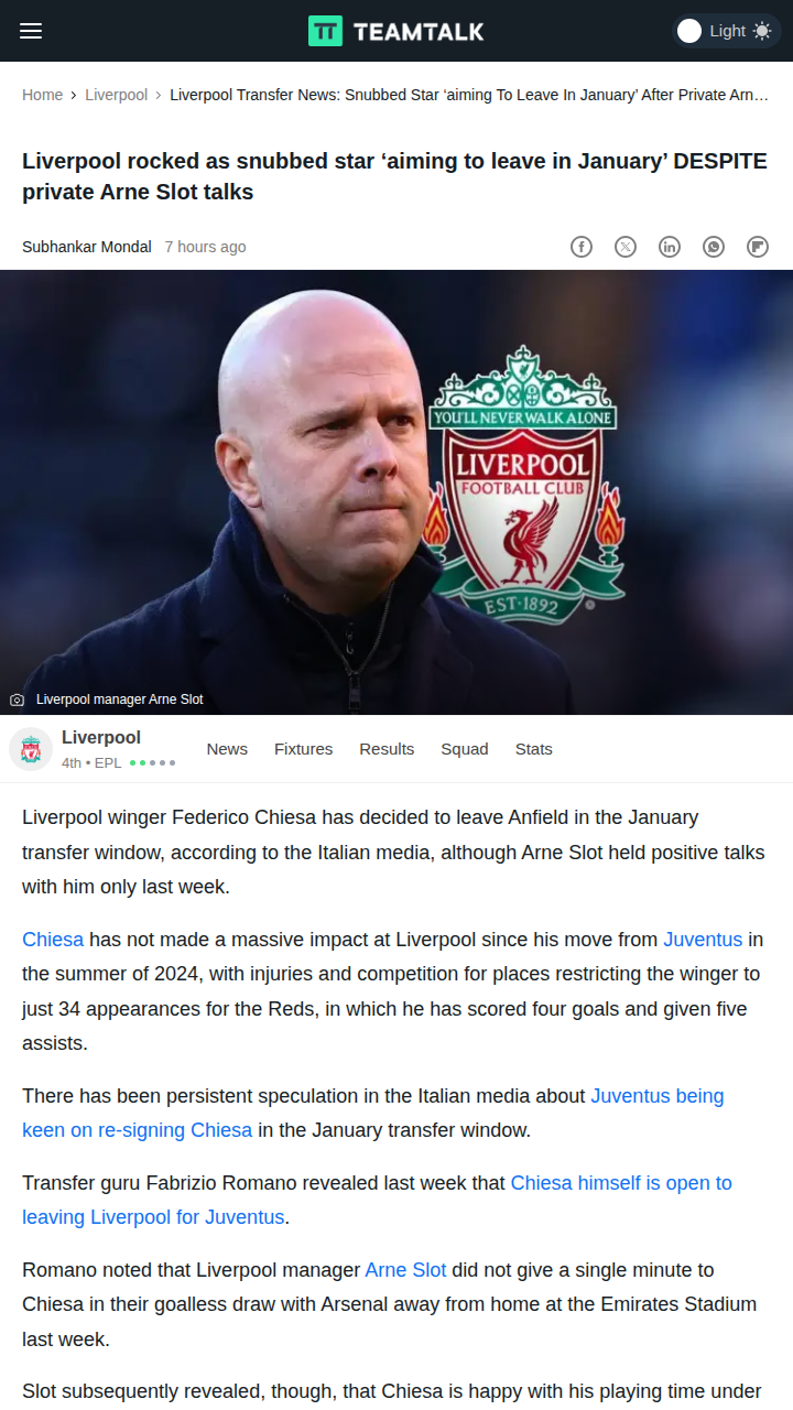 watkinsross+FollowChiesa’s Liverpool Exit: Juve Rivalry Heats UpLooks like the Chiesa saga at Anfield is coming to a head. Despite positive words from Slot, the Italian winger is reportedly pushing for a January exit, with Juventus ready to swoop back in. The fact that Chiesa didn’t get a minute in the goalless draw against Arsenal has only fueled talk of a return to Serie A. Will Liverpool cash in, or is there another twist in this transfer rivalry? #Sports #Soccer #LFC00Share