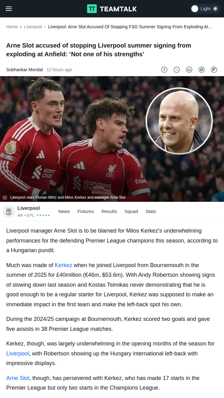 Jillian Morse+FollowSlot Sack Rumors Swirl Before Arsenal ClashReds fans, the Anfield rumor mill is in overdrive! After a rocky autumn, whispers from Spain claim Arne Slot could be out this week, with Xabi Alonso—Madrid’s own midfield maestro—allegedly lined up as his replacement. Despite a recent unbeaten run, draws against Leeds and Fulham have kept the pressure on. Will FSG really pull the trigger before the Arsenal showdown? Let’s hear your take: stick with Slot or roll the dice on Alonso? #Sports #Soccer #LFC00Share