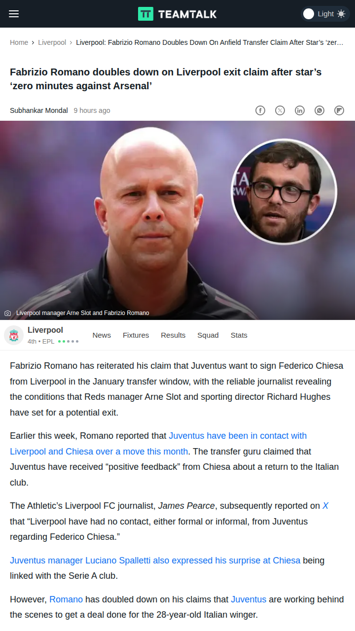 watkinsross+FollowChiesa Transfer Saga: Arsenal Snub Fuels Juve RumorsInsiders are buzzing after Federico Chiesa’s zero minutes against Arsenal, with transfer guru Fabrizio Romano doubling down on Juventus’ push to bring the Italian winger back. Despite the Old Lady’s creative loan ideas, the Reds’ top brass won’t let Chiesa go unless a big offer lands—think loan with obligation to buy. With Liverpool’s injury list and King Mo at AFCON, this one’s heating up. Next week could be decisive! Thoughts on Chiesa’s future, Kopites? #Sports #Soccer #LFC00Share