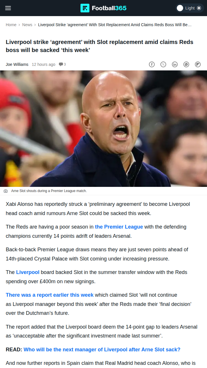 Jillian Morse+FollowSlot Sack Rumors Swirl Before Arsenal ClashReds fans, the Anfield rumor mill is in overdrive! After a rocky autumn, whispers from Spain claim Arne Slot could be out this week, with Xabi Alonso—Madrid’s own midfield maestro—allegedly lined up as his replacement. Despite a recent unbeaten run, draws against Leeds and Fulham have kept the pressure on. Will FSG really pull the trigger before the Arsenal showdown? Let’s hear your take: stick with Slot or roll the dice on Alonso? #Sports #Soccer #LFC00Share