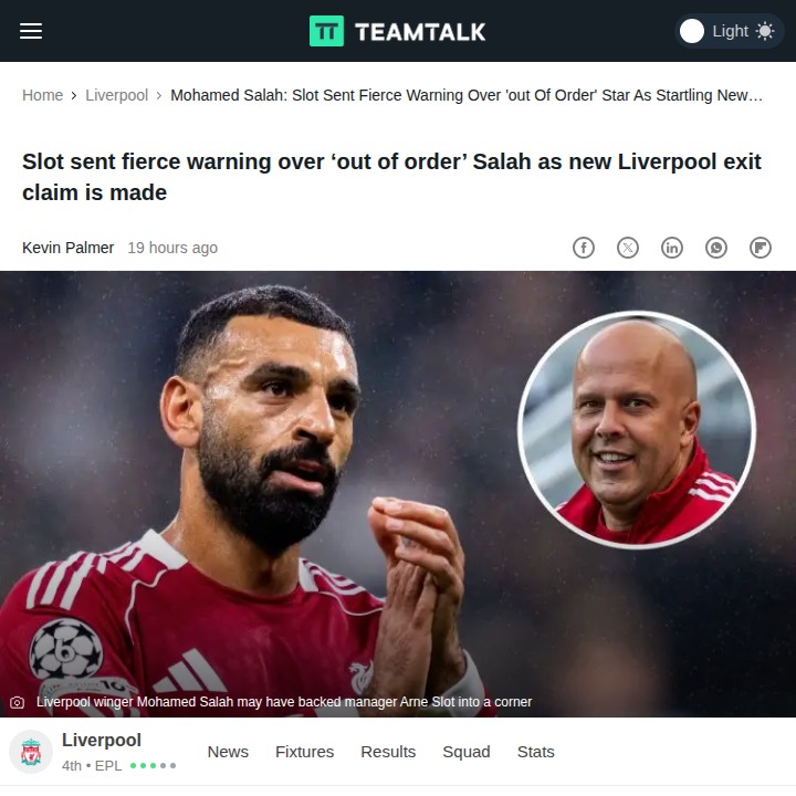 Allison Travis+FollowMo Salah vs Slot: Reds’ Power Struggle Heats UpThe King of Anfield, Mo Salah, is at the center of a major showdown with new boss Arne Slot. After being benched and voicing his frustrations to the media, Salah’s future looked shaky—especially with Saudi clubs circling. But with Isak’s injury and Liverpool’s form dipping, insiders say Slot might have no choice but to bring Salah back into the fold after AFCON. Will this uneasy truce hold, or is a summer exit inevitable? #Sports #Soccer #LFC00Share