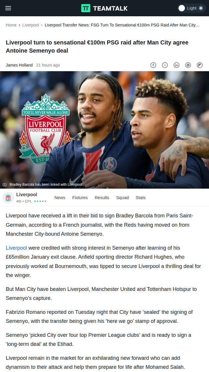 kochcandice+FollowLiverpool Eye Barcola After City’s Semenyo CoupBig news, Reds! After Man City swooped in for Semenyo, Liverpool are now all-in on PSG’s Bradley Barcola. The French winger, known for his electric pace and creativity, could be the answer as the club plans for life after Salah. With Barcola feeling undervalued in Paris and PSG eyeing new forwards, this €100m move could heat up the rivalry with United and Arsenal, who are also circling. Could Barcola be the next Anfield star? #Sports #Soccer #LFC00Share