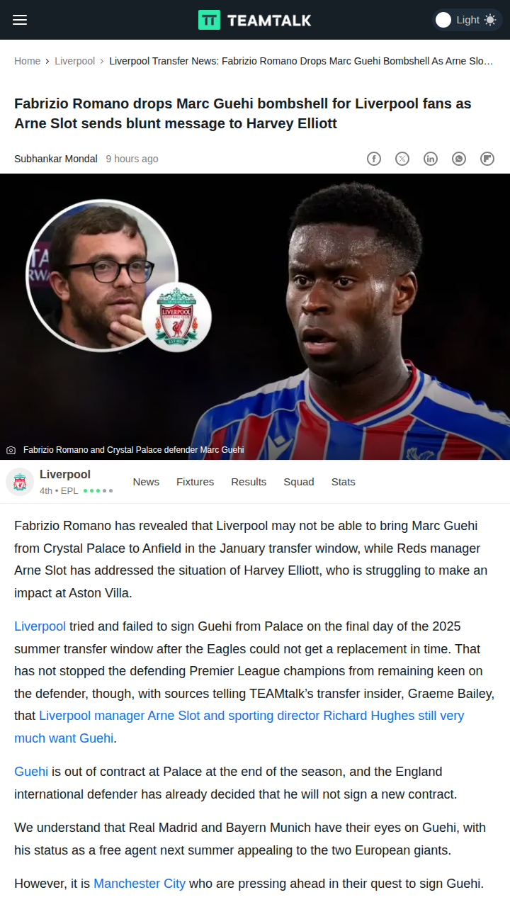 rogerschristine+FollowMarc Guehi Transfer Tug-of-War Heats UpBig news for Reds fans: Fabrizio Romano just dropped that Liverpool’s hopes of landing Marc Guehi this January are fading, with Man City making a serious play for the Palace star. The Guehi saga is turning into a real Premier League rivalry, as Bayern and Real Madrid are also circling. Meanwhile, Arne Slot is keeping it blunt on Harvey Elliott—no Anfield return on the cards. Thoughts on Guehi’s next move? #Sports #Soccer #LFC00Share