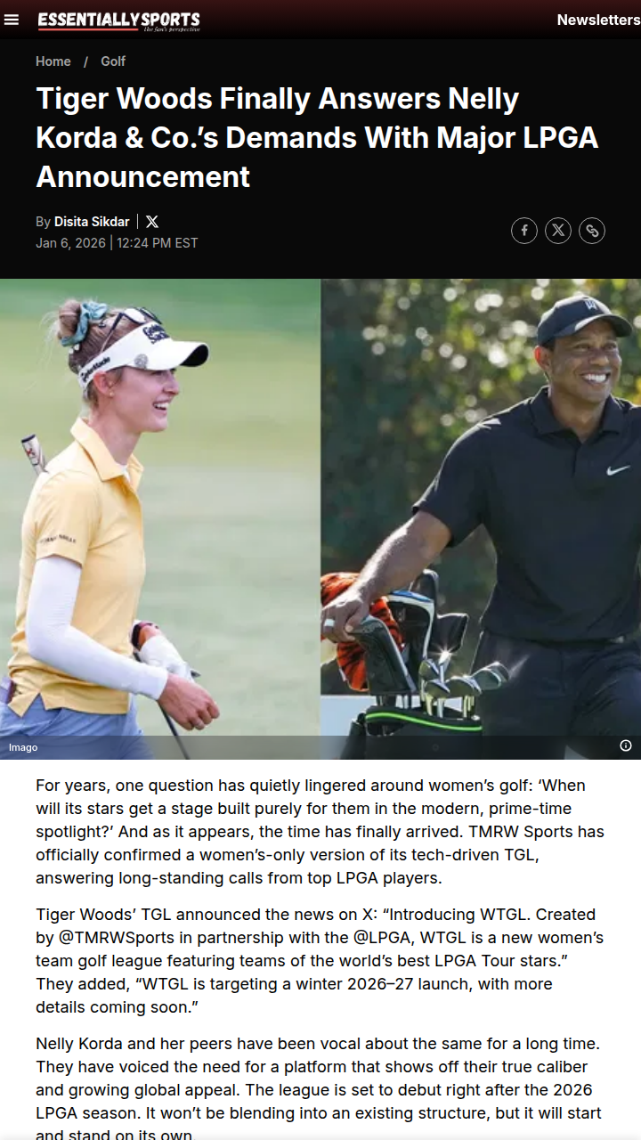 frank59+FollowTiger & Nelly Spark New Era for LPGABig news for golf fans: King Tiger just answered Nelly Korda and the LPGA stars’ calls for their own prime-time stage! TMRW Sports is launching WTGL, a women’s-only team golf league, set to debut after the 2026 LPGA season. This isn’t just another add-on—it’s a standalone league, finally giving the LPGA’s best the spotlight they deserve. Rivalries and new legends incoming! #Sports #Golf #LPGA00Share