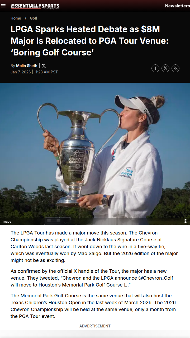 Gabriella Gonzalez+FollowHouston’s LPGA major move stirs up golf fansThe LPGA’s Chevron Championship is making a big switch in 2026, moving from the highly rated Carlton Woods to Houston’s Memorial Park Golf Course—a venue that just hosted a PGA Tour event. This decision has the golf community buzzing, with some calling Memorial Park a “boring golf course” for such a major event, while others are excited to see the women’s game on a more public stage. Do you think this change will help grow the sport, or does it risk making the major less special? Let’s hear your take! #Sports #Golf #LPGA00Share