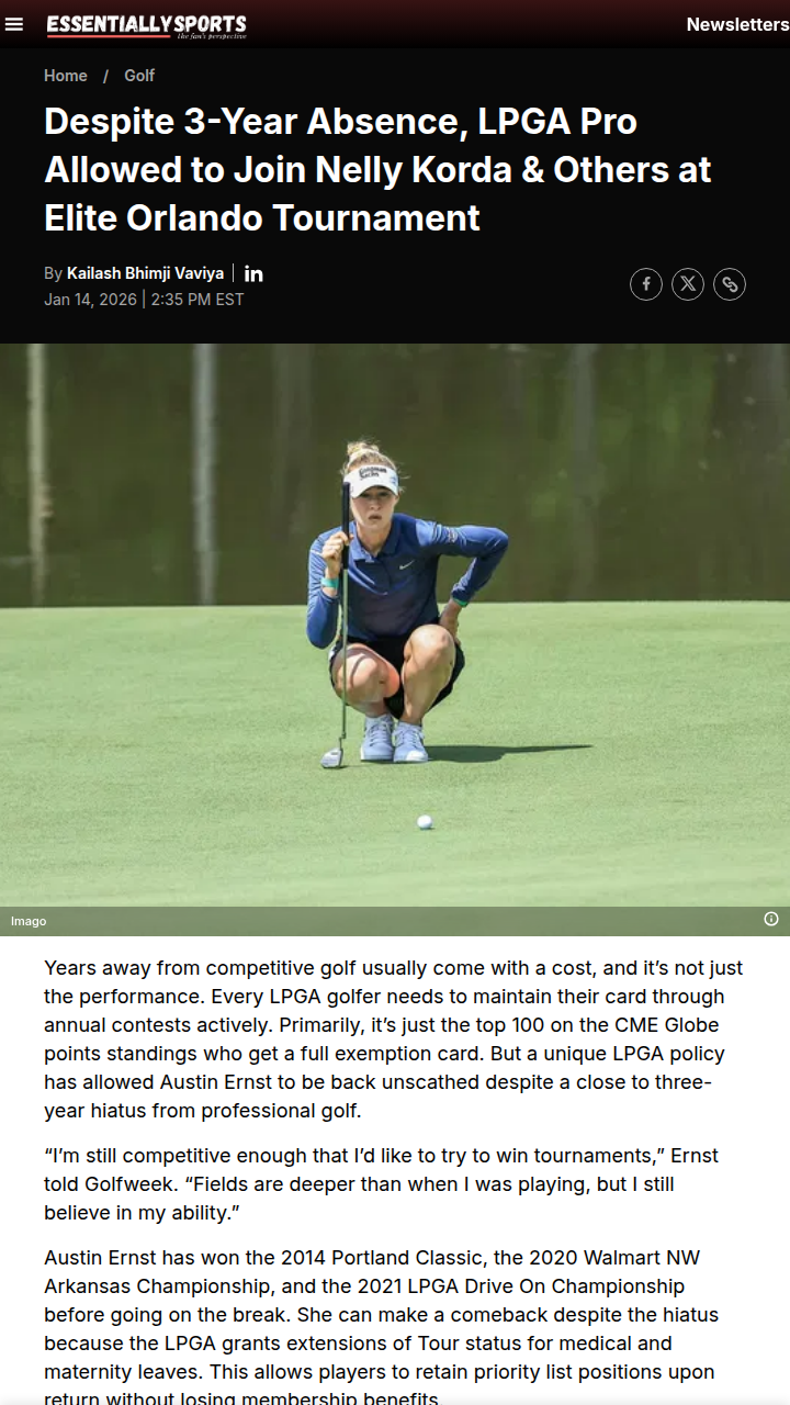 Gabriella Gonzalez+FollowAustin Ernst’s Comeback: LPGA’s Second ChanceThree years off the tour and Austin Ernst is still teeing it up with the best, thanks to the LPGA’s progressive medical and maternity leave policy. The 3x champ, who once ruled the Drive On, is set for a 2026 return at the Tour of Champions, facing off against Nelly Korda and the new elite. Ernst’s journey is proof that the LPGA’s rules are giving pros a real shot at balancing life and competition. Thoughts on how this policy shapes rivalries and comebacks? #Sports #Golf #LPGA00Share
